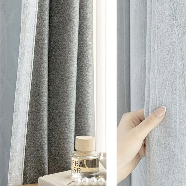 95%-os Creamy Velvet Virágmintás blackout, Világos szürke szín - Folyékony textúrájú, kellemes tapintású bársonyos drapériák, amelyek nem gyűrődnek le, megakadályozzák a napfény behatolását és hőszigetelő szerepük van a hideg évszak alacsony hőmérséklete és a hőhullám ellen.